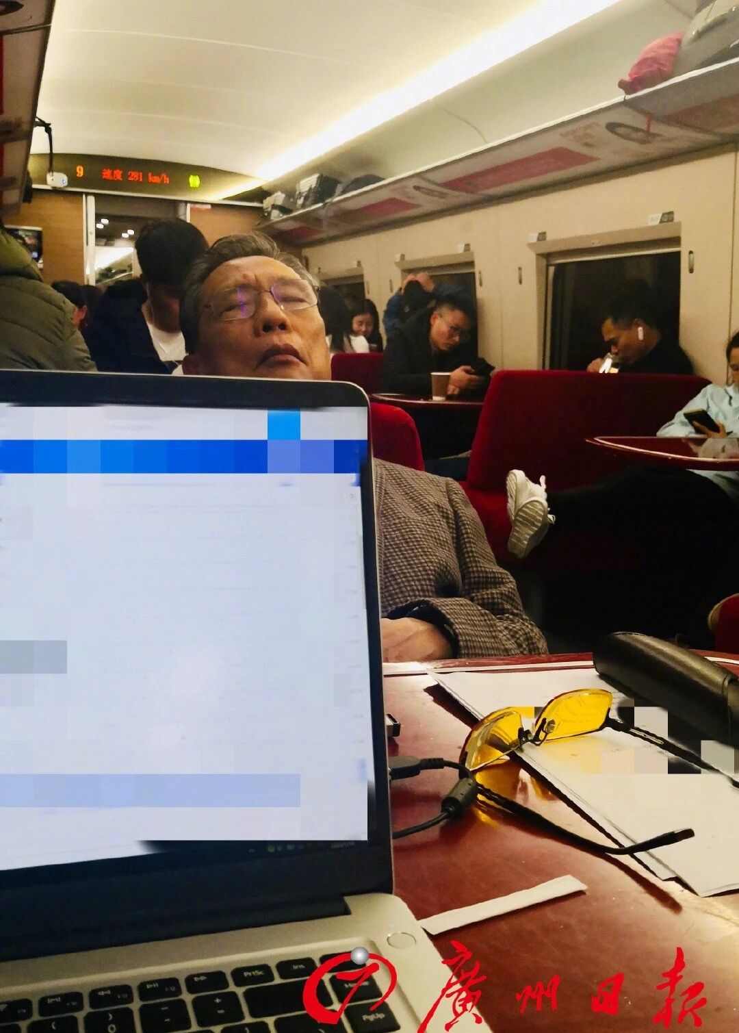 正值春运高峰期,临时上车的他只能被安顿在餐车的促狭一角。刚落座不久,在狭小的餐桌座位上,他立刻拿出相关文件研究。忙碌一会儿后,连日奔波的他仰倒在座位上,闭目凝思。