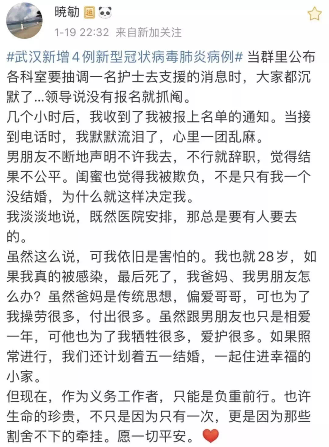 一个28岁的护士在微博上分享她被抽去支援疫区的心情。