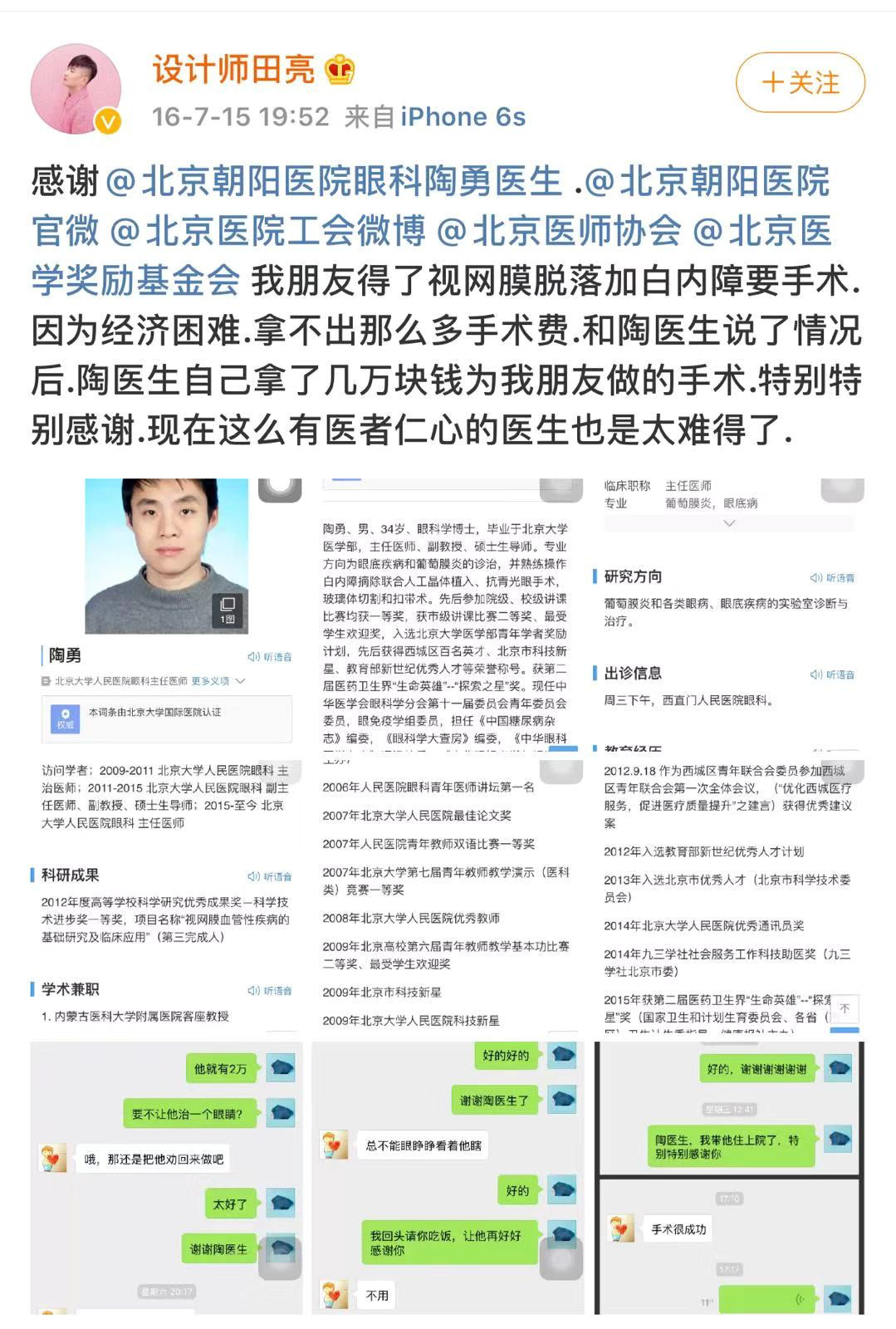 陶勇医生受伤后迅速得到网友关注,发现陶勇医生不仅履历无比优秀,在病患口中的口碑也十分动人,曾自己贴钱给病患做手术,也是健康快车上为无数白内障贫困患者实施免费复明手术的医生,也是极少数愿意给艾滋病患者做手术的医生。