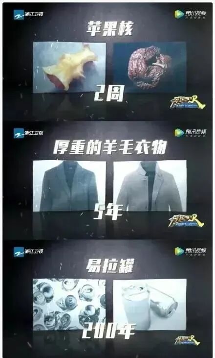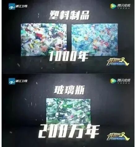 在节目一开始,节目组就给大家看了这样一组数据:苹果核的降解时间为2周,厚重的羊毛衣物为5年,易拉罐为200年,塑料制品为1000年,玻璃瓶达到了惊人的200万年……这些数字真的是,直击人心。