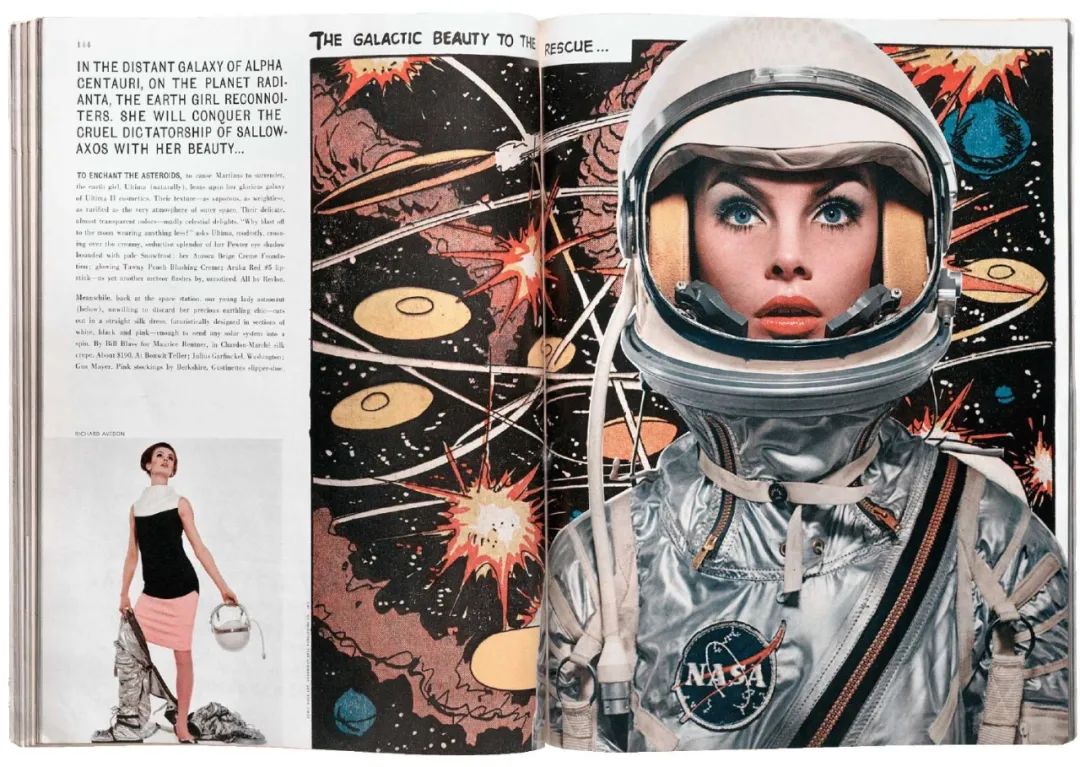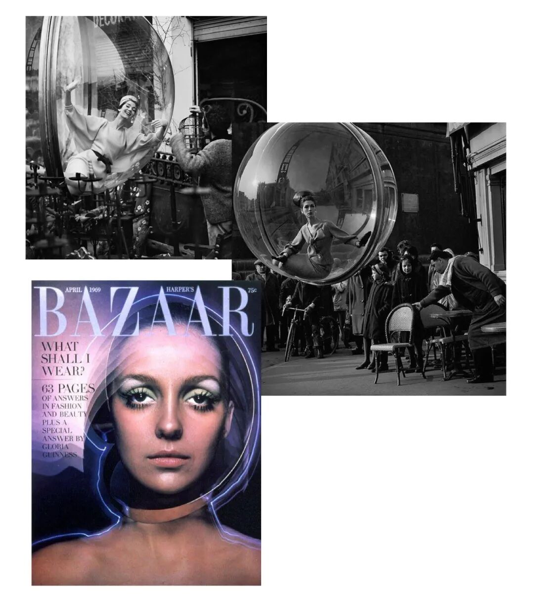 1965年,Jean Shrimpton穿着飞行服戴着太空人头盔登上《Harper‘s BAZAAR》封面。设计师André Courrèges和另一位space age的设计师Pierre Cardin都同样设计了以太空人头盔为灵感的头盔帽,同时还出现在电影《2001太空漫游》中。
