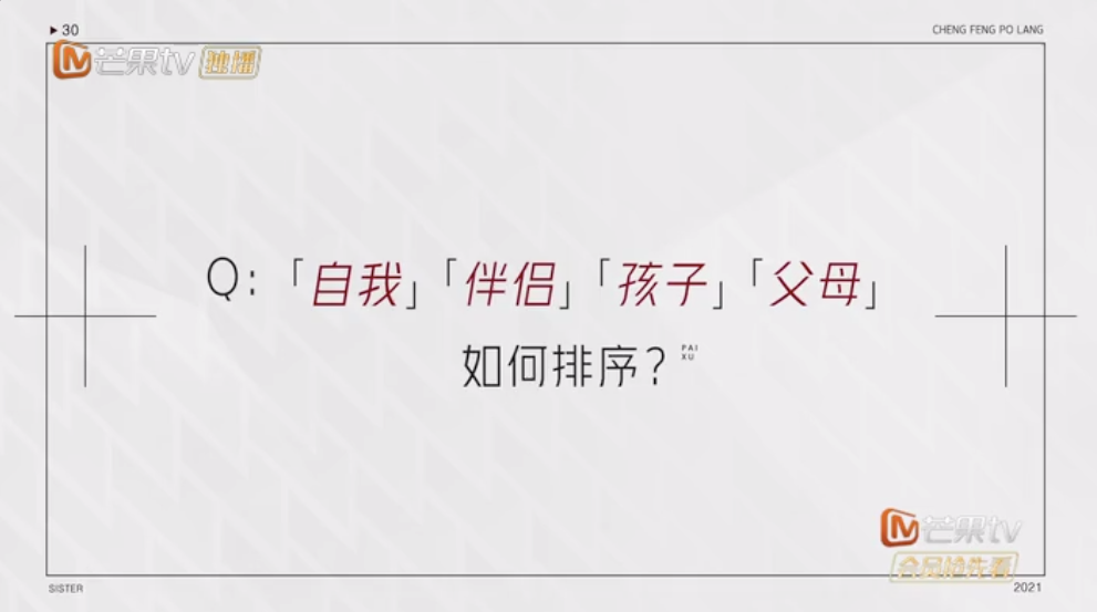 而这一切都有迹可循,人们往往会在日常的言行举止中流露出最真实的生活状态。芭姐注意到,在节目的拍摄片场中,张柏芝和几位姐姐一起聊起了关于人生排序的问题。那英觉得,家人拥有优先级。而她自己怎么样都行,并不会把自己放在第一位。那英还对大家说,有时候在机场照着镜子都不敢相信那是自己,身上背的、手上拿的经常都会是老公和孩子的东西。而且她还说自己在舞台事业和家庭之间的角色转化会非常快,因为家里没人买她是大明星的账... ...😂同样是作为一名母亲,而且是三个孩子妈妈的张柏芝,大家都以为她会和那英一样,将子女们放在最重要的位置。但张柏芝却给出了出乎意料的答案:她会把自己放在心目中第一的位置,然后才是孩子、亲人和伴侣。“因为如果我都不清楚自己,就没有办法保护我最爱的小孩和家人。”坐在旁边的董璇也对这个观点表示认同,她觉得自己也会把自己放在第一位,然后才是孩子、父母和伴侣。董璇觉得,最重要的其实是要保护好自己,然后才能更好地保护自己的家人。至于伴侣,在董璇这儿也只能垫底。因为之前婚姻的坎坷,董璇对于这个排序有了更深的见解:“本来婚姻就是有风险的,然后你再什么都不干了、回归了家庭,当你的婚姻出现了问题的时候,你想重新再来,是很难很难的。”芭姐觉得,关于人生排序这个问题,是没有标准答案的,姐姐们说的都有可取之处。像那英描述的那样,芭姐认为作为一名母亲、妻子、女儿,女性们需要顾及的东西太多,肩上担负的责任也很重。这种情感的纽带让她们的内心变得柔软,不自觉地就把自己的优先级降至了最后。但同时也正如张柏芝和董璇说的,做自己的第一顺位没有什么不对,在考虑或者照顾别人的同时,也不能忘记了自己本身。