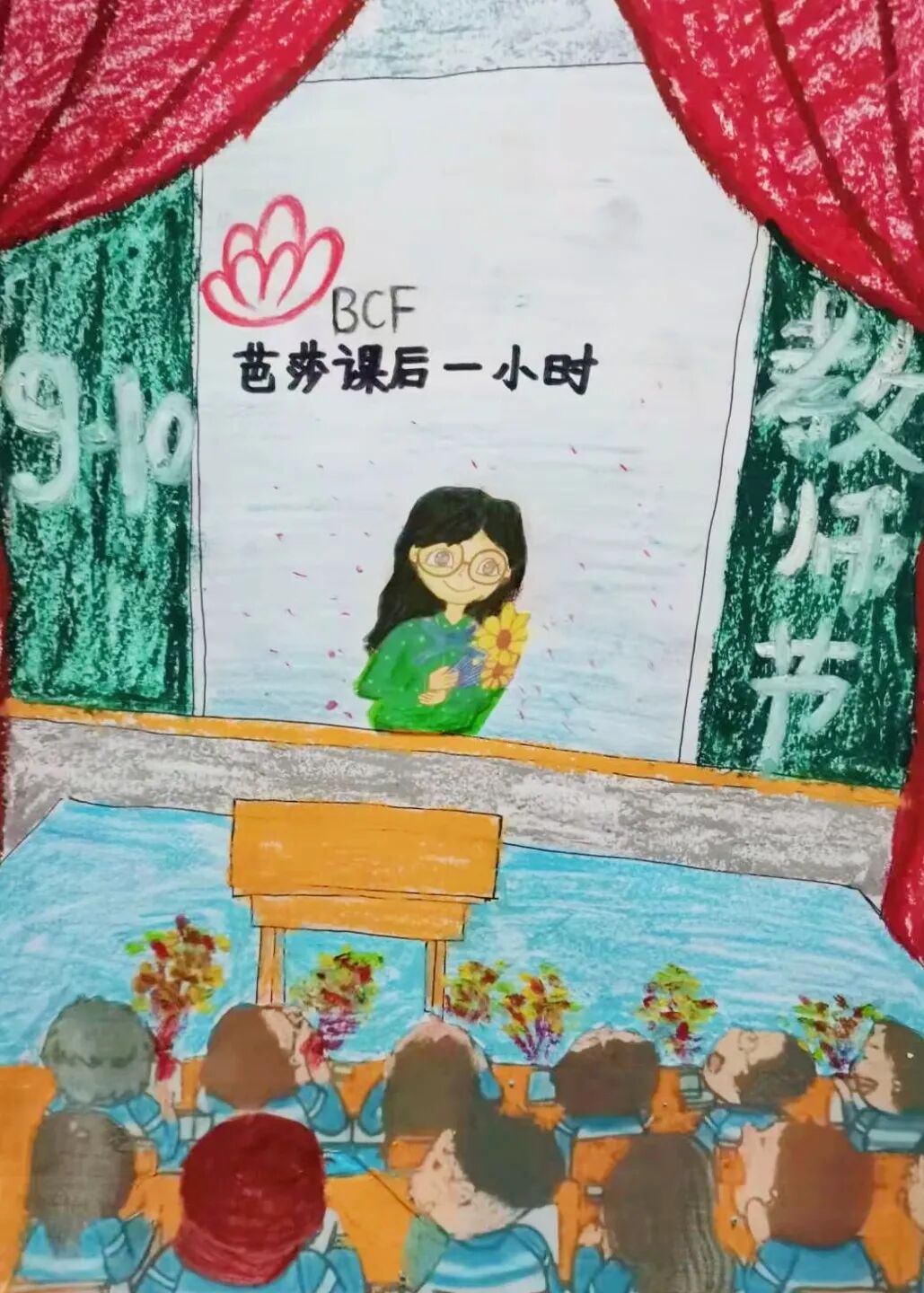 总说着“我再讲最后一分钟”的TA、念叨着“这道题我要点名来做”的TA、静校后仍留在办公室仔细批改试卷的TA、校运会上与你一起为健儿们摇旗呐喊的TA……曾经因他们害怕过、感动过、兴奋过的你我,再回首,这些在求学路上温柔同行的人,正是鞭策、鼓励我们不断前行,奋进拼搏的精神动力。在第37个国际教师节到来之际,我们邀请“芭莎·课后一小时”美育公益项目校的二到五年级的小朋友,将心中对老师的感情,展现在画纸上。"芭莎·课后一小时"美育公益项目通过开发美育课程、培育乡村美育教师、提供美育教学设备等方式,希望让教育资源分配不均匀的问题得到缓解和改善,让更多的乡村儿童能接受到美育教育的熏陶,助力乡村美育发展。在孩子们的童真世界中,与他们共度成长时光的老师,是这样:初识知识,班级是课堂、是游乐场,老师就是那个带着大家玩玩闹闹的大朋友。