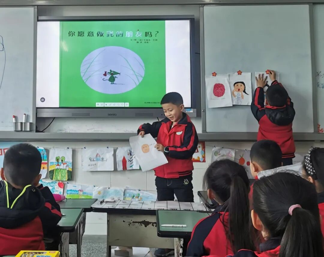 早在一年级学生入学时,张老师便格外看重阅读教学的重要性。她相信,阅读和写作将会是孩子一生的财富。阅读仿佛海绵,将缠绵于文字中的教诲温和地浸润心田;而写作便是孩子们心灵的出口,给予他们展示自己情绪和体验的能力。阅读习惯的养成,首先建立在孩子们对书籍的喜爱之上。由此,张老师时常参与教学技能研习,学着为学生选择适合阅读的主题读物。挑选过程中,她渐渐为绘本的魅力折服,看似简单卡通的绘画、简短的故事,总能牢牢抓住孩子们的兴趣。绘本的阅读难度很低,带给孩子们的益处却远超想象。平实俏皮的叙述方式,同中低年级孩子的思维非常接近,阅读起来既像是他们走进了故事,又像是有个同龄朋友正手拉着手,一起分享世上各式各样的奇妙冒险。孩子们的兴趣点就是探索已知的、未知的一切。围绕在生活中的场景和大山外的未知,对他们同等重要的。自从芭莎美育教室入驻,张老师时常给孩子们推荐乡土主题的绘本,《母鸡萝丝去散步》、《爷爷一定有办法》、《彩虹色的花》、《好饿的小蛇》……也许,他们还无法柔情地表达内心对家乡的眷恋,但阅读中心心念念的一切,亦是年少时喜欢的表达。每次集体阅读时间,张老师都将共度的美好时光记录下来。最开始,她只在班级家长群中发布零散的读后感集锦;后来,她会将孩子们埋头读书的认真、即兴发言的童真、分享心得的热情以拍照录像的方式系统展示给家长。不少家长正在此间发现,原来家里那个或调皮或沉默的孩子,竟然还有热爱读书的另一面。他们对少儿阅读的态度,逐渐从惊讶,转为认可、支持。对乡村学生的家长而言,购置“没有几个字”的课外绘本读物,多数情况下是难以理解的事。但令张老师自豪的是,她们班级中的家长,从未纠结过这方面的支出。“如果能将阅读‘可视化’,它会为参与其中的每个人带去一股劲儿。人都是从被看到、被相信中获得激励,而彼此给予的认可,恰恰又能产生很强的凝聚力。我们一起走进阅读、爱上阅读、分享阅读,那么就不会有人掉队。”