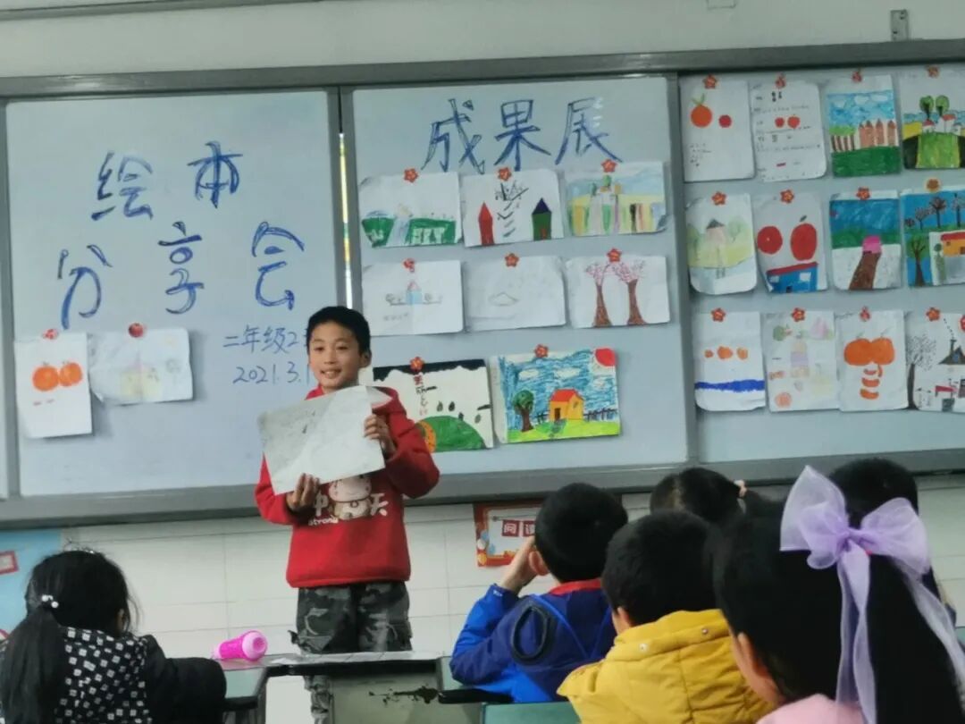 每周的“特别时光·绘本阅读课”,是张老师与孩子们共同期待的日子。那一天,除了共读绘本的快乐,更隐藏着意想不到的温馨与惊喜,静候着他们一齐揭晓。小黄(化名)是位极度内向的孩子,由于身体缘故,他几乎不与班里其他同学沟通,说话支支吾吾的。上课时,他几乎不与班里其他同学沟通互动,不能连贯地说一句话。只能两个字或者三个字地,把想法“挤”出来。但是他喜欢画画。无论是在草稿本、语文书上,还是桌子上。无论是在课上还是在课下,在任何时间、任何地点、任何媒介上都尽情地展示着他的绘画功底,说实话,站在教学管理的角度,张老师曾数次感到头大;可作为孩子们的大朋友,她仍然选择支持小黄的爱好,在学期初便多送了他几个美术本,鼓励他尽情展现自我。在《声音》绘本阅读课上,张老师正带着大家用彩笔绘画万物落下来的声音场景。其他同学拿着自己的画作分享:瞧啊,西瓜掉在猪八戒的肚子上是“pang”的一声;鸡蛋落在地上是“bia ji”一声;雨点落在芭蕉叶上,是“啪嗒啪嗒”的轻响……正当大家你一言、我一语地讨论时,小黄忽然举起了他的小手。彼此眼神直愣愣地对视了好几秒后,张老师这才激动地反应过来,这是小黄入学接近两年来,第一次举手。张老师将小黄邀请到讲台上,小黄自豪地挺起胸膛,展示着画作。画中,三个坦克画得活灵活现,好似即将奔赴战场。但这看起来与本节课的主题——“生活中的声音”毫不相关,同学们开始有了窸窸窣窣的笑声。张老师温柔地摸了摸小黄的头,鼓励地拢拢他的肩膀,耐心地询问:“孩子,坦克画得真棒。那你觉得坦克是什么声音呢?”小黄低头想了想,羞涩地笑了,然后他面向全班同学,以朗诵般的声音“宣告”:“坦克的声音是‘突突突’!”尽管这不过是简单的几个字词,但张老师明白,大庭广众下表达出此心中所想,对小黄是极大的挑战。伙伴们的欢笑与鼓励中,小黄绽放出纯真而欢欣的笑意,用不太清晰的话语,希望将这三只坦克送给全班同学。欢呼声、掌声、感谢声像一串爆竹炸响在教室,而“小画家”小黄,正笑得合不拢嘴,小脸更是红扑扑的,可爱得想让人亲一口……一次完美的《声音》绘本分享会,在浓浓的喜悦与成就感中收尾。每位同学都获得了帅气的坦克,小黄的画作更是第一次得到了所有人的称赞。 “老师……我喜欢……这个。”回到座位前,小黄悄悄牵住了张老师的衣角,指了指黑板上的绘本图片。回首这一年多来的美育经历,她更加理解了“美”之于孩子们的珍贵。比起取得任何结果或表彰成就,孩子们在这间教室中与书为友、有爱相伴,心灵被柔软而温暖的情怀包围,自然而然地成长为同样温柔细腻的人,能够耐心聆听身边的声音、真心为他人的优秀喝彩,正是张老师与孩子们遨游于美育天地,最珍稀的收获。