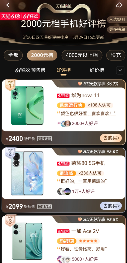 不管是nova11、nova11 Pro还是nova11 Ultra,他们凭借着亮眼的设计、强大的产品功能,在2k-4k档位中,与竞品相比具有明显的优势,不久前nova11更是取得了天猫平台2000元档手机预售榜、热销榜、好评榜三榜第一的好成绩。