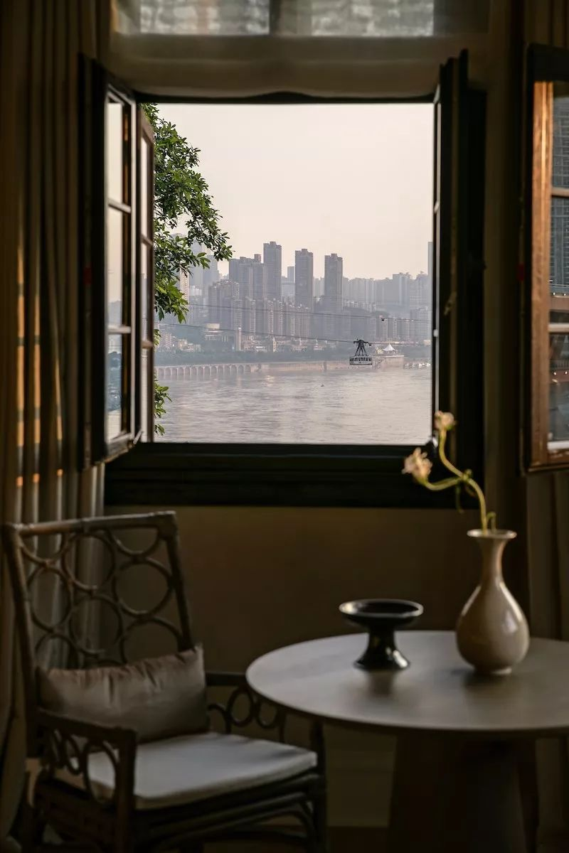 酒店所处的位置能够看到重庆的两江与渝中半岛,在现场勘察的那天下着小雨,置身民国时期的建筑内,当时的轻轨声音划入耳畔,眼前是极现代化的江北城新区,以及重庆的两江,造成一种时空穿越的错乱感。