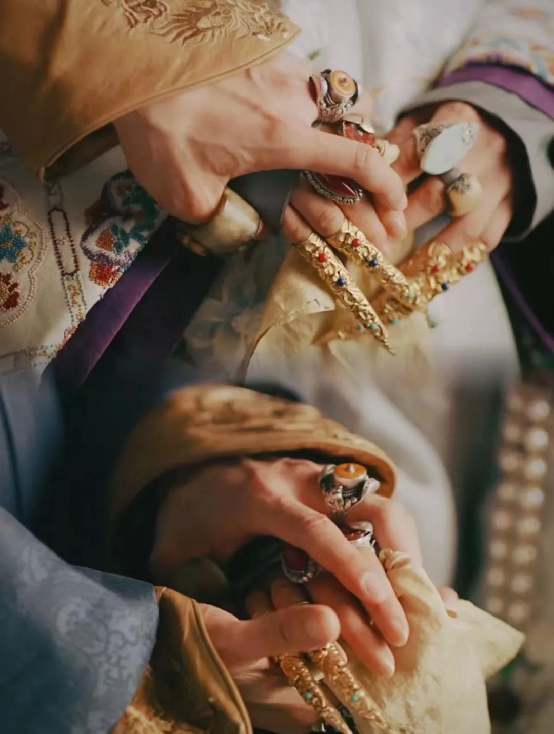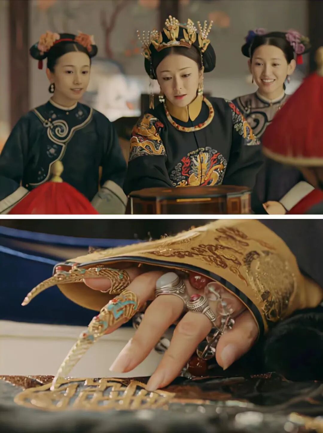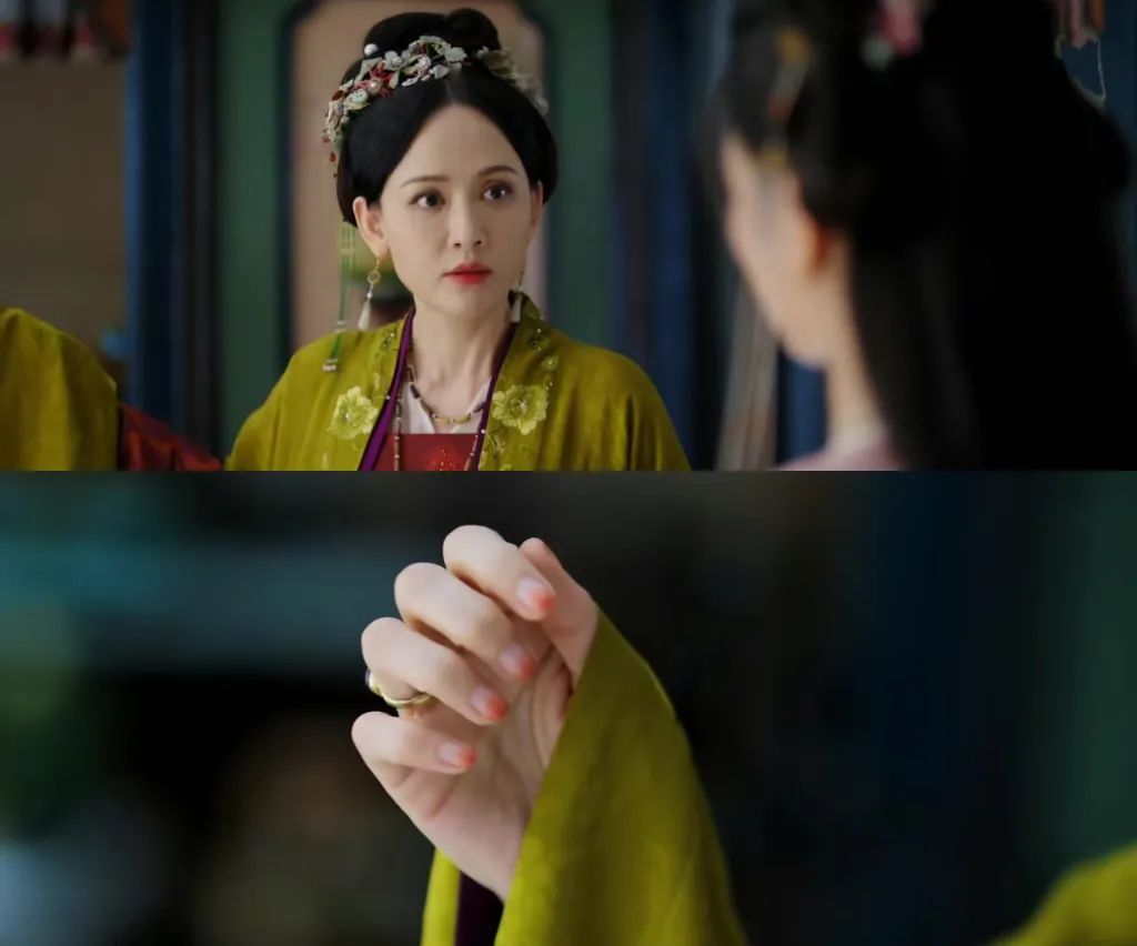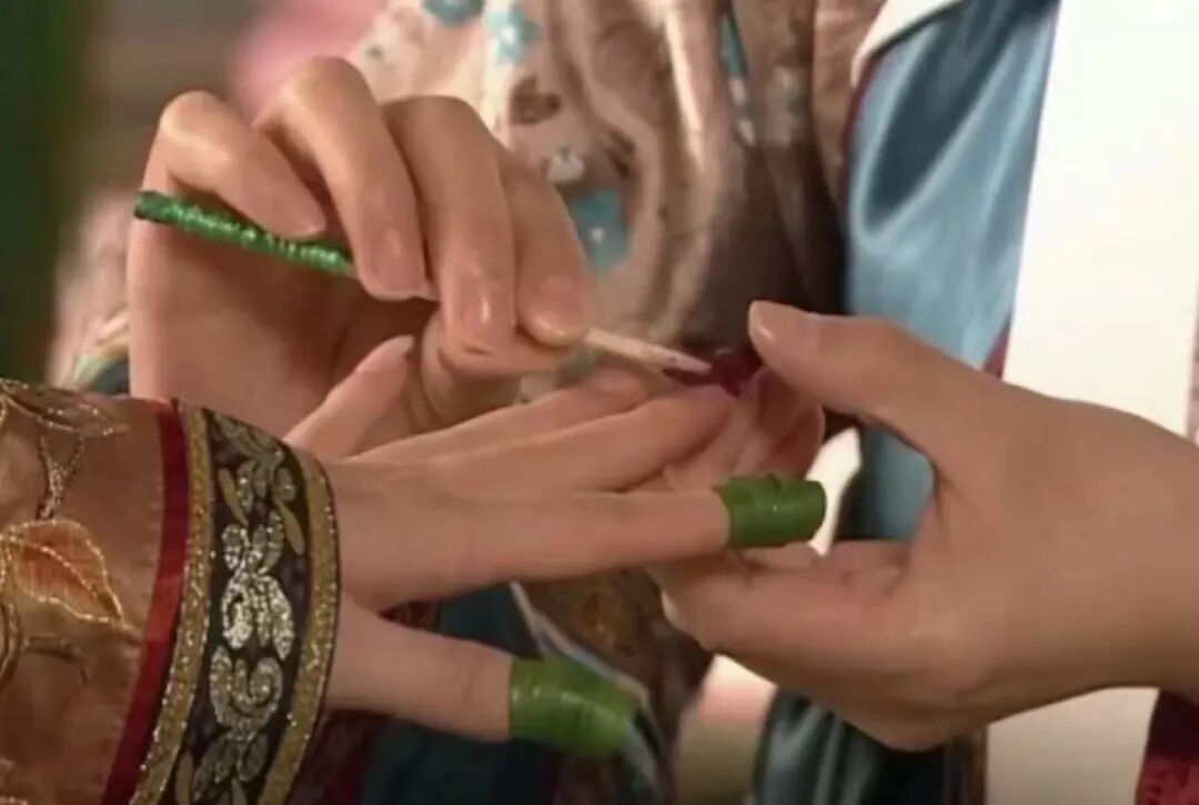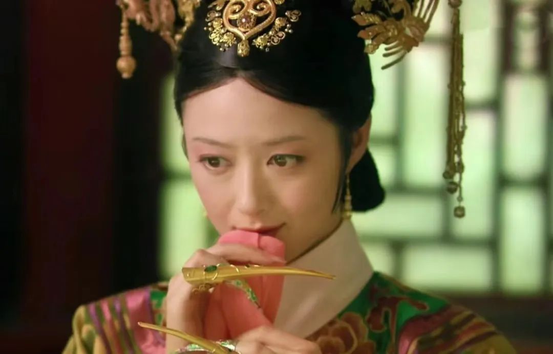 此外,中国古代对女性的纤纤玉指有着独特的审美传统,长指甲能从视觉上修长手指,让手如柔荑,玉指青葱,再配以装饰,更添纤细美感和妩媚韵味。比如清宫戏中娘娘们的长指甲总是夺人眼球。