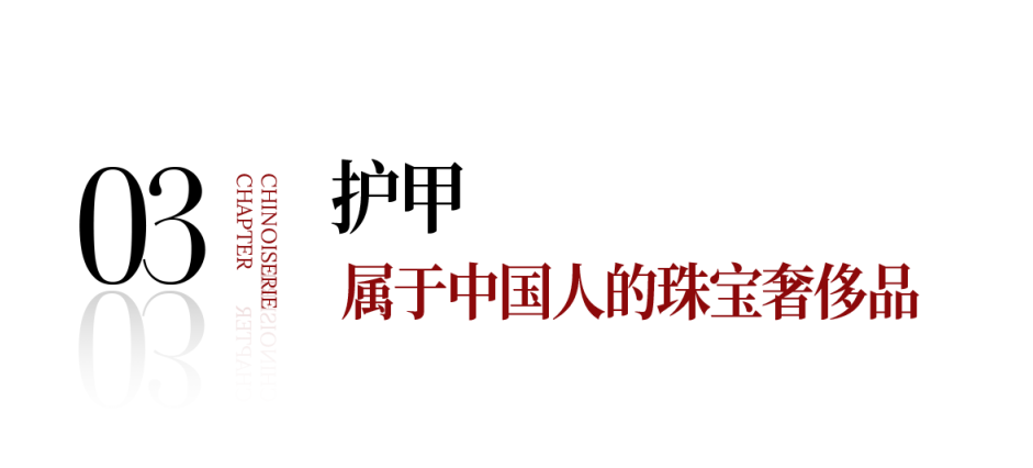 到了清代中晚期,护甲尤为流行,在清朝宫廷里风靡一时。清宫嫔妃们喜欢蓄甲,以展现玉指葱秀之美,并用各式护指装饰,将指甲套“玩”出了新高度,且妃位越高,指甲套越名贵。
