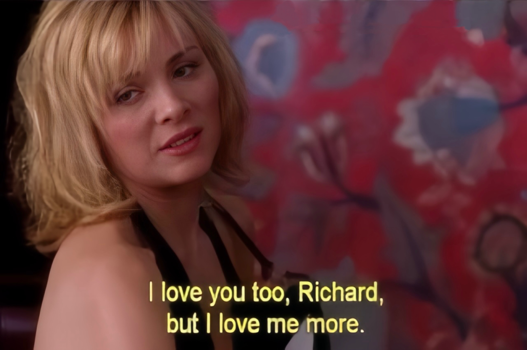 莎姐为数不多的一次长期关系,是遇上了跟她棋逢对手的理查德。两人从随便玩玩到惺惺相惜,再到开始像普通情侣一样送礼物、说情话。起初,莎姐对这样亲密的关系感到不适,直到有一天,她发现自己开始担心理查德出轨,对接近他的所有女人保持警惕,她意识到自己正在被这段关系困扰。爱情中的占有欲正让她失去自己。于是她做出了一个意想不到的举动:她主动结束了这段关系。这里出现了Samantha的惊世名言:“I love you,but I love me more.”