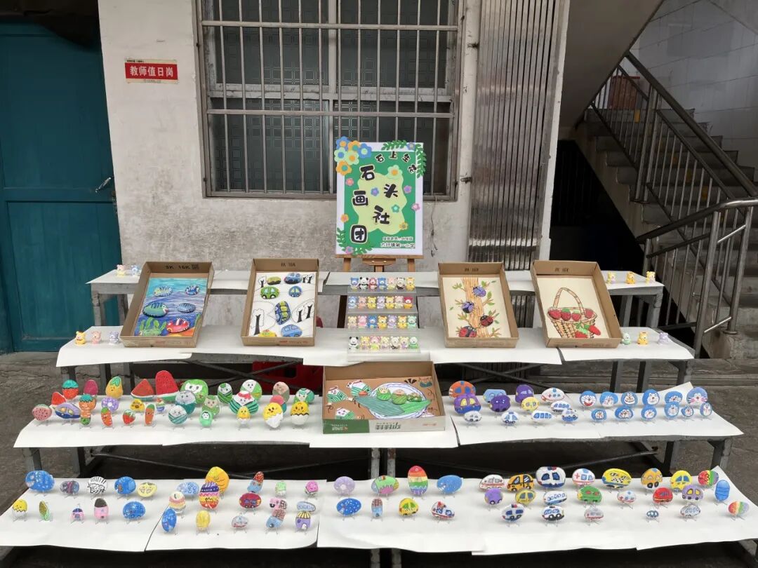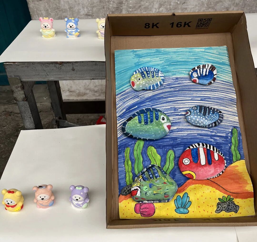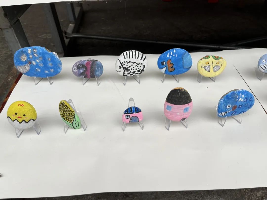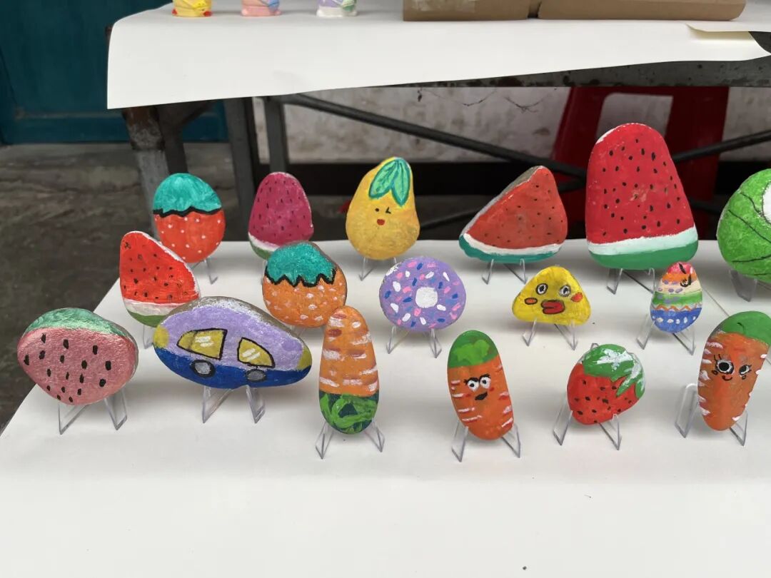 有的石头“潜入海底世界”,化身为一条条色彩斑斓的鱼群;有的石头“攀上高大树枝”,变身成一只只背着彩色花壳的瓢虫;有的石头“装点餐盘果篮”,摇身一变成应景的粽子和诱人的草莓。
