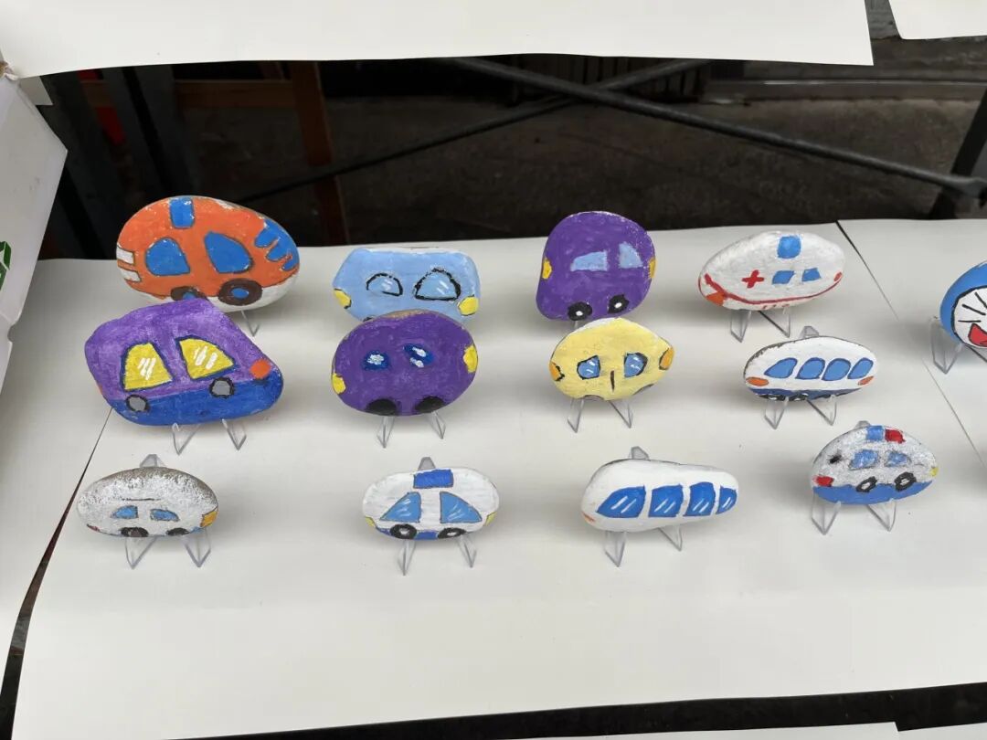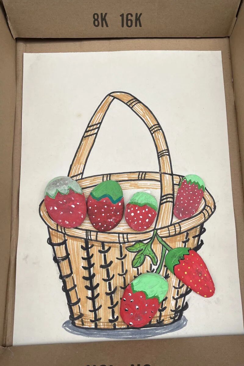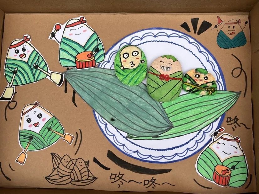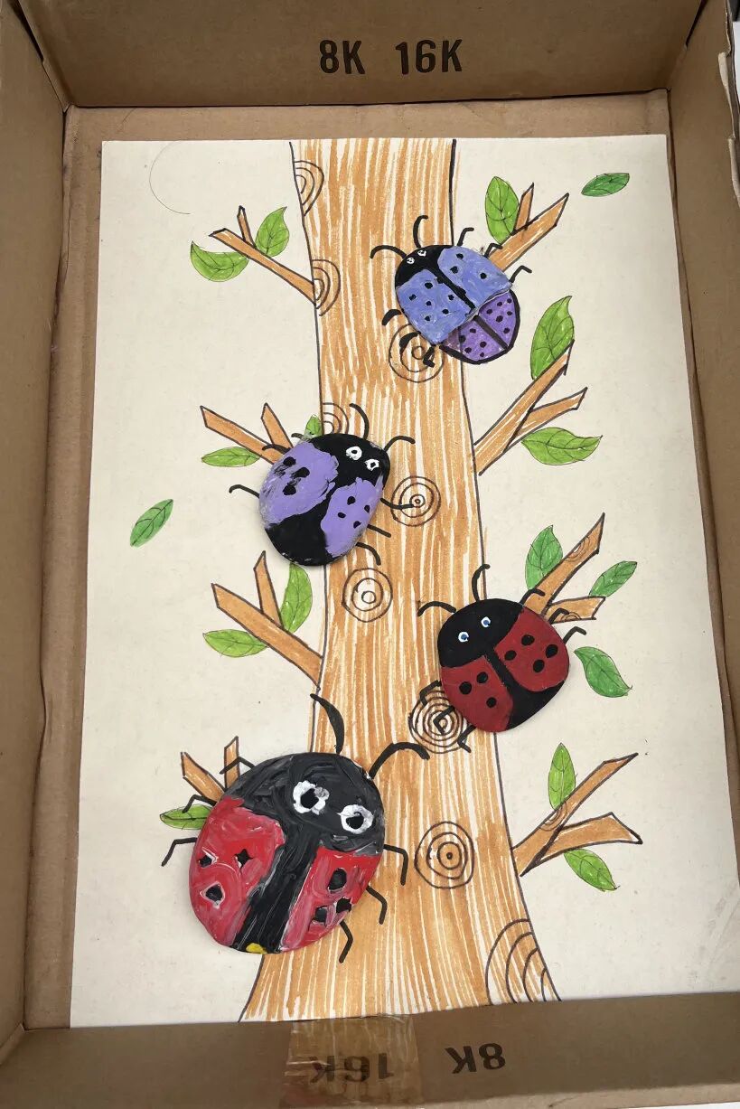 有的石头“潜入海底世界”,化身为一条条色彩斑斓的鱼群;有的石头“攀上高大树枝”,变身成一只只背着彩色花壳的瓢虫;有的石头“装点餐盘果篮”,摇身一变成应景的粽子和诱人的草莓。