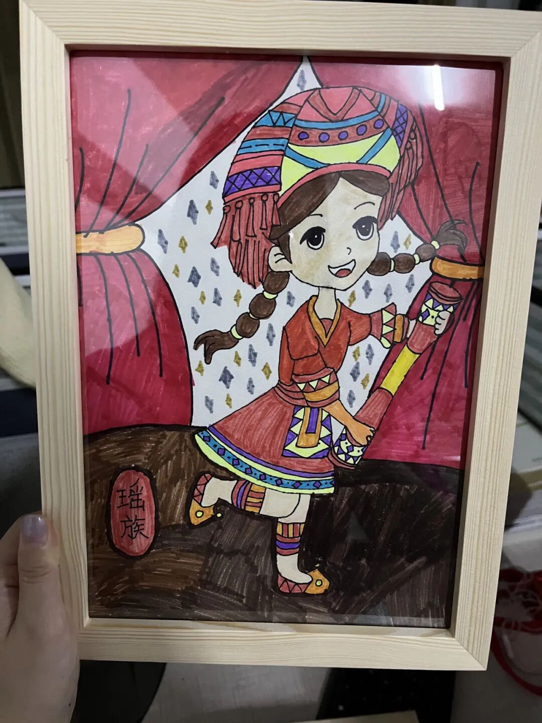 “有一次我看到一个跳舞不是很自信的男孩在画画,称赞了他的简笔画画得很好看,后来在慢慢相处中他和我熟悉起来,期末的时候特地送了我一幅我在打长鼓舞的画,我特别感动。”