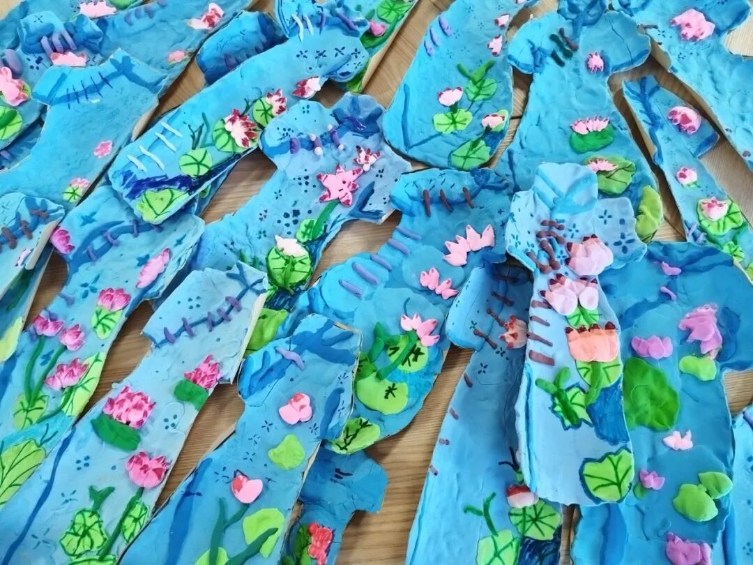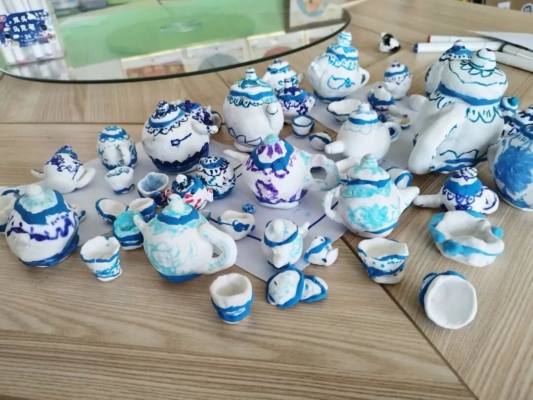 在田老师分享的照片中,一个个充满着江南风韵的莲花荷叶旗袍尤其亮眼。用材料包编织的彩色手提袋,映照着孩子们的张张笑脸。蓝白相间的青花瓷样式的茶壶茶杯,让人想象着下一秒就溢出屏幕的茶香。