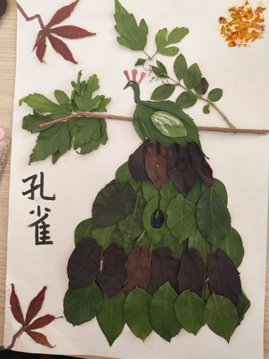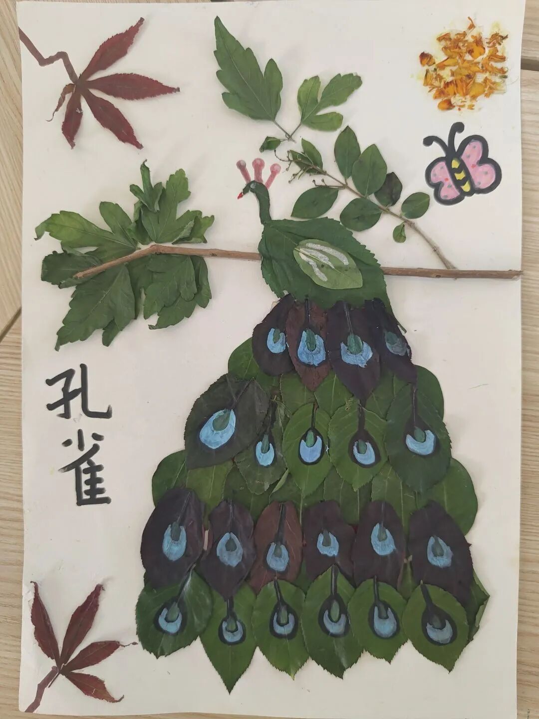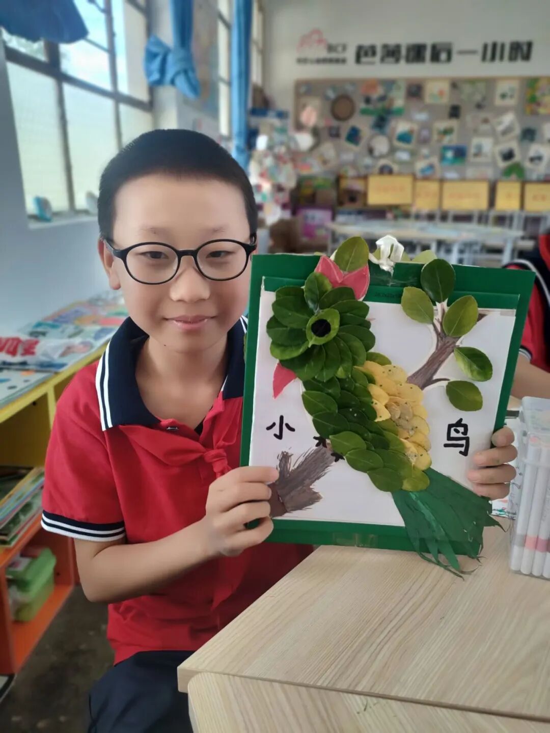 男孩创作的双面树叶拼贴画,一面是茂密的大树,一面是灵动的小鸟