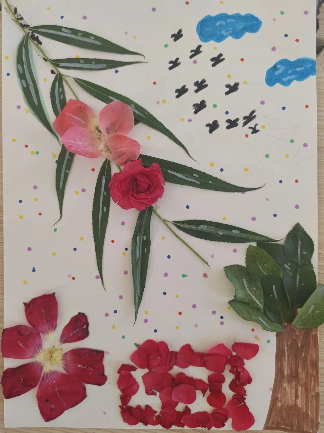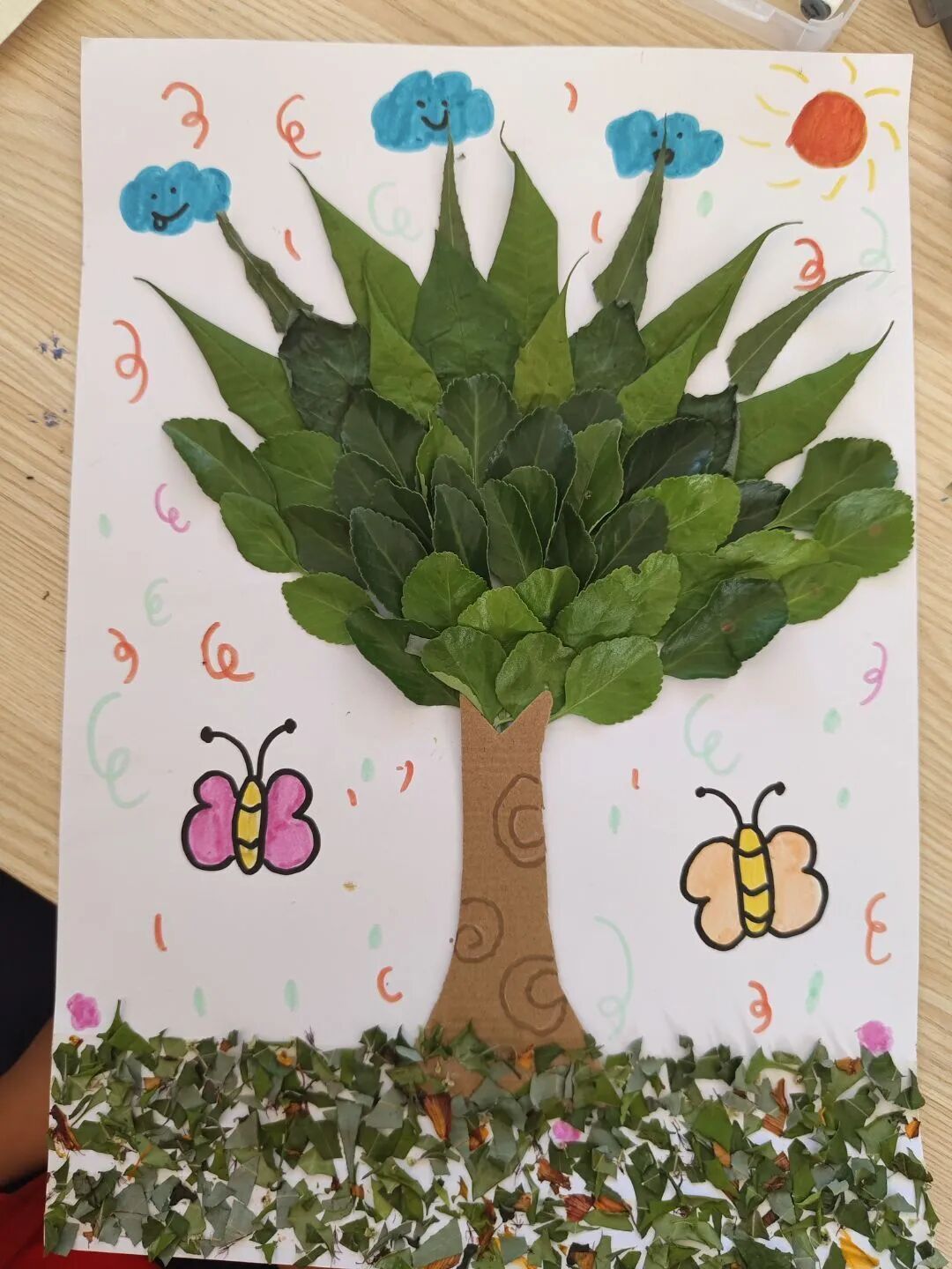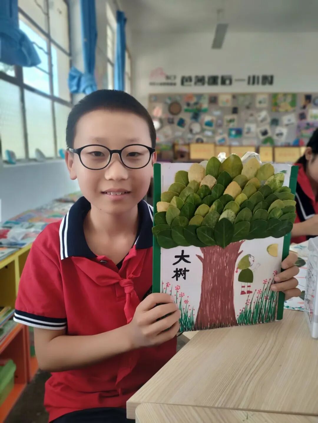 男孩创作的双面树叶拼贴画,一面是茂密的大树,一面是灵动的小鸟
