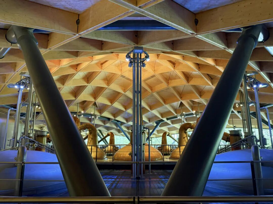 麦卡伦酒厂内部,由2500多块精密定制的三角形木结构支撑,这些木材来自可持续认证林场