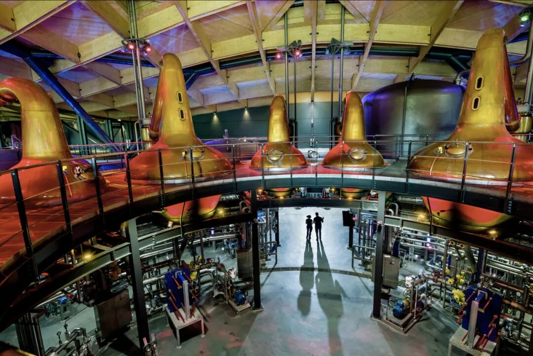 建筑的设计从未试图遮蔽这些生产过程。相反,它邀请你——以一位观察者的身份——与酒液同处一室,静静体会蒸汽的升腾与冷凝,铜壶表面的温润与呼吸。整个参观动线并非高高在上的俯瞰式参观平台,而是与设备齐平的通道:你能听见蒸馏时铜腔轻微的震动,能看见酒液在冷凝器中的缓慢回旋,甚至能嗅到空气中混合着焦糖、果仁与木屑的香气。