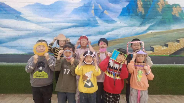 闪电河乡寄宿制小学的孩子们制作卡通头饰