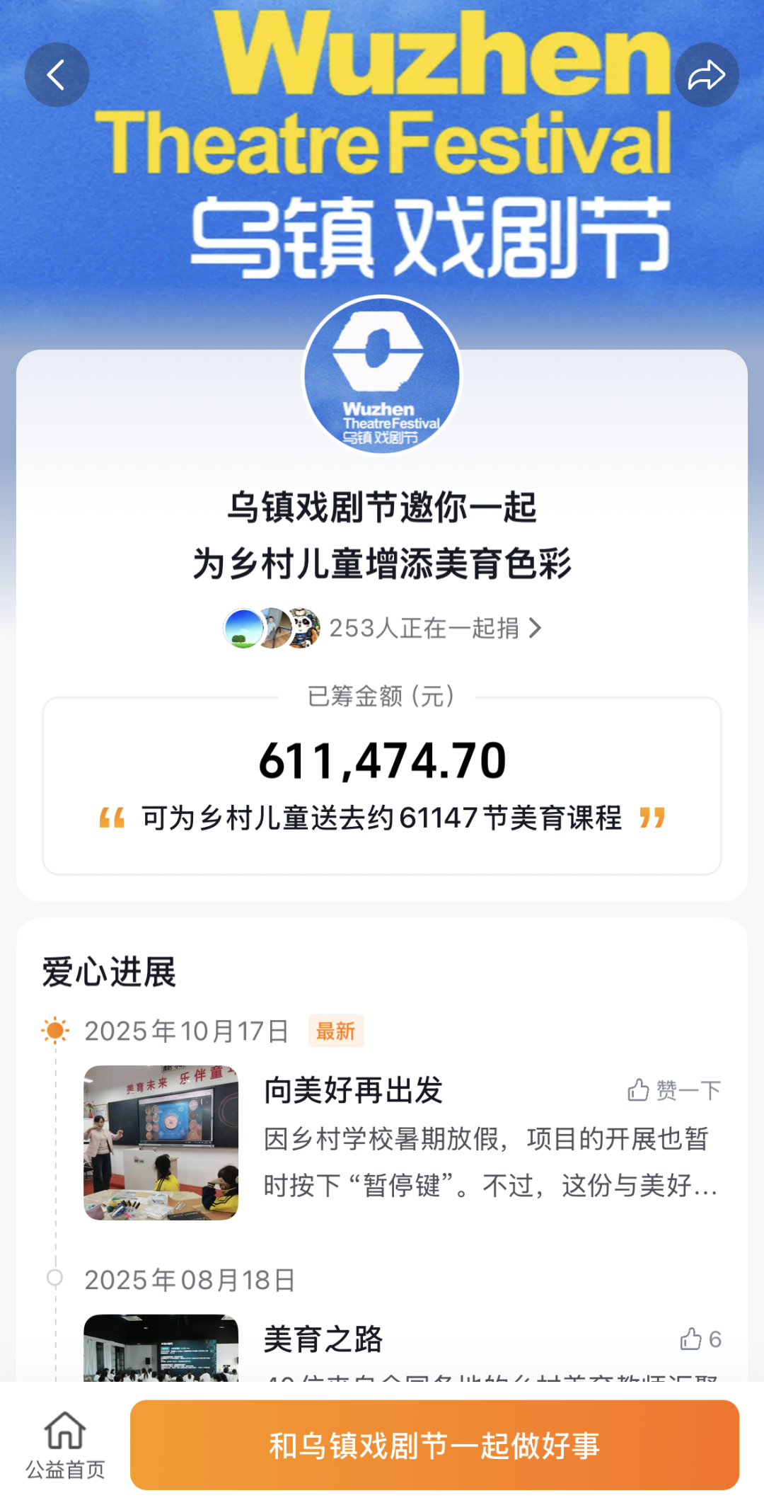 在这场艺术与善意的同频共振中,没有人是旁观者。从乌镇的戏剧艺术家到扎根乡村小学的美育老师,从公益路上的同行者到在美育教室里戴着卡通头饰、全心演绎童话的孩子们,共同成为了这场盛大节庆里最鲜活的主角。