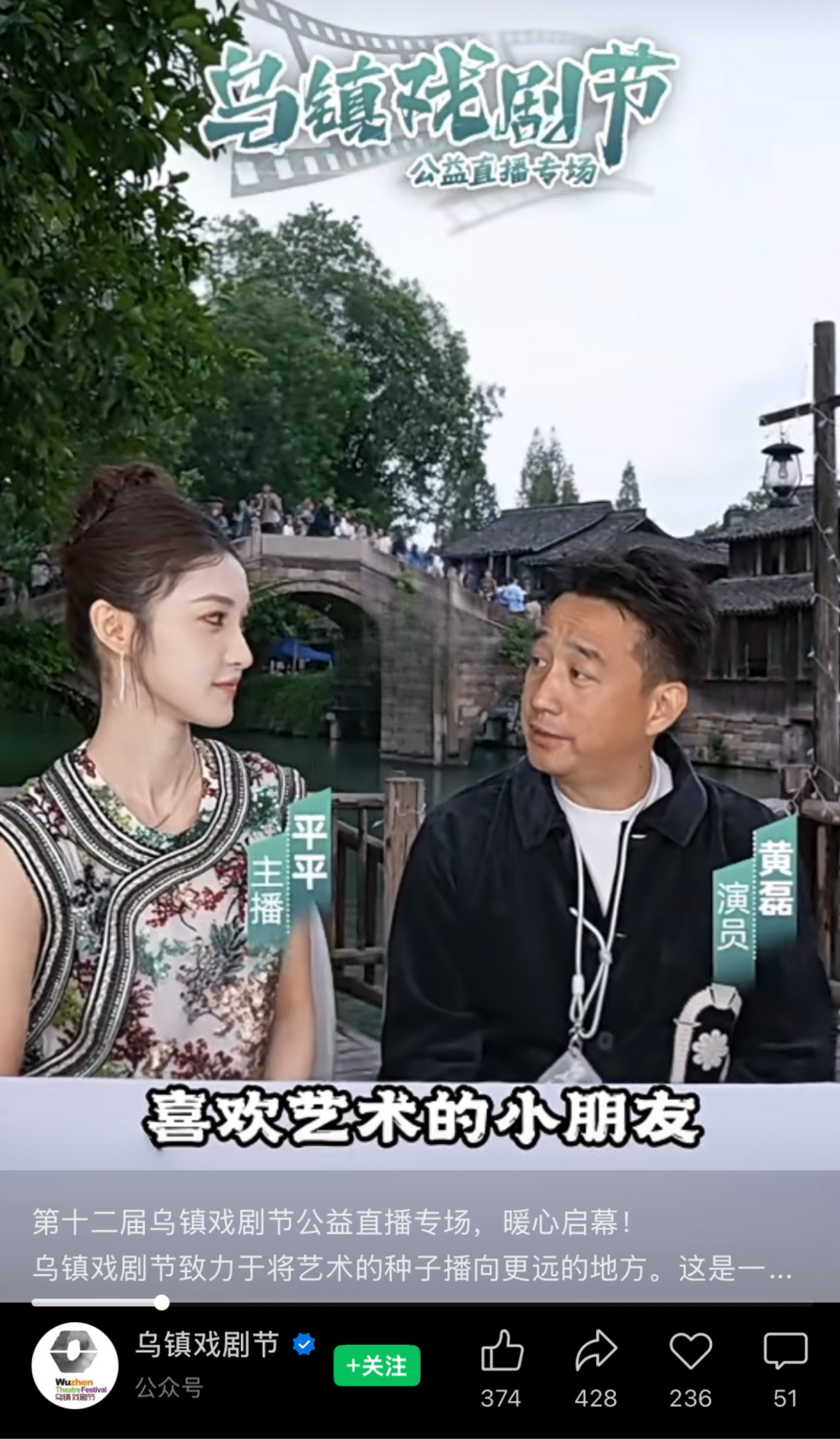 戏剧节期间,一场特别的公益行动正在萌芽。第十二届乌镇戏剧节在抖音平台开展公益直播,在桐乡市人民政府指导下,携手具有广泛社会影响力的“课后一小时”美育公益项目,让戏剧的艺术力量,借助互联网的桥梁,跨越山河,润泽乡村美育的土壤。