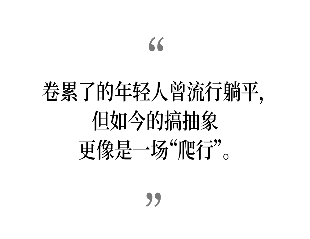 孙漫漫:抽象文化的起源和流行带有很强的草根属性。抽象地解构,也是属于经济下行期的冷眼旁观。学历贬值,普遍的内卷,就业压力大,工作不好找,上升通道日益狭窄,像任何一代年轻人一样,如今的年轻人面临着无法被上一代理解的压力。而工作上的领导,学业上的老师,家里的父母,这些情感,经济,地位上的掌权者又偏偏是上一代人,权力上的不对等,和情感上的不调和,让弱势地位的年轻人难以真正解决问题,只能自己糊弄一下自己。