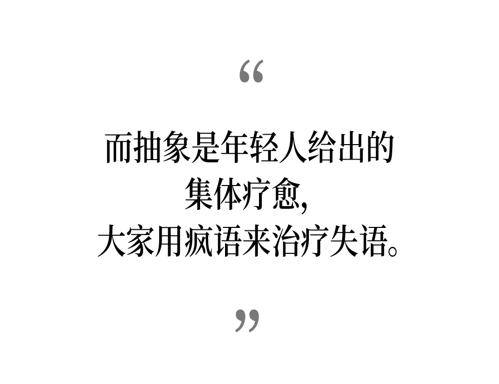 抽象是不再用逻辑语言叙述痛苦,而是破坏逻辑发泄痛苦。语言的可读性让人的交流成为可能,但令人费解的抽象并没有阻断人与人的联结,而意外地成为暗号,在人群中高效匹配发疯搭子。