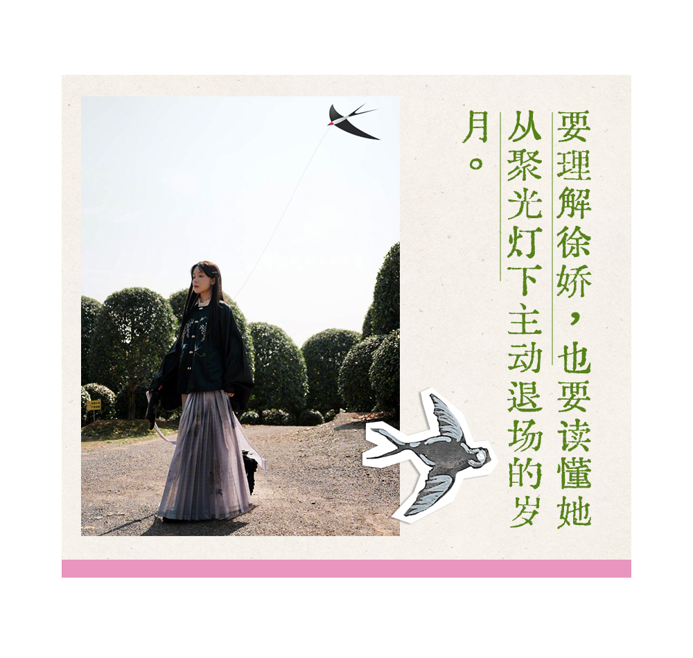 向外的延伸也落在更实际的生活里,徐娇曾坦言“很排斥直播”,但为了自己的汉服品牌「不娇造」,如今她也能在镜头前稳稳地坐满三小时。这对她而言,是跨出舒适圈的一步,但所有变化并非源于某个戏剧性的顿悟时刻,更像是一种持续了许久的、静默的内化,终于到了可以自然流露的阶段,于是她开始主动向外延伸,在生活的土壤里稳稳扎下自己的根系。