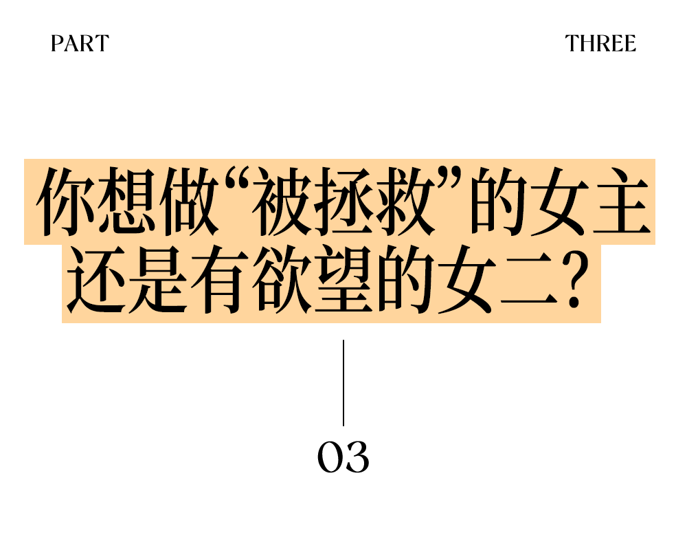 在现实中,对女性而言,追求欲望和赢得尊重是分离的。你想要获得社会的认可,就必须先学会“阉割”自己的欲望,满足欲望和得到他人认同只能二选一。在社会规范中,“好女性”往往不能像男人一样,有钱、权、性等欲望。