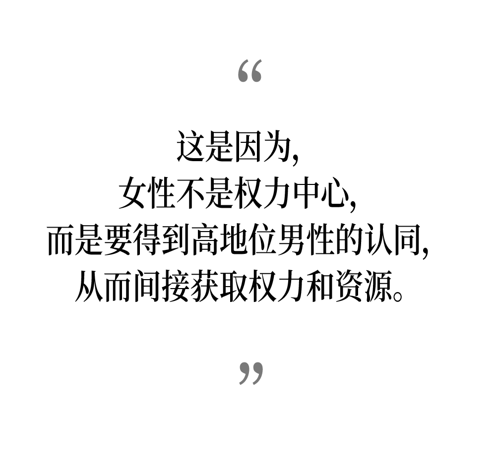 而女性的处境则不同,在这种社会中,真正高地位的女性,不是工作能力强的女性,而是被高地位男性所“供养”的女性。她们通过婚姻和性从高地位男性那里分享了权力和资源。