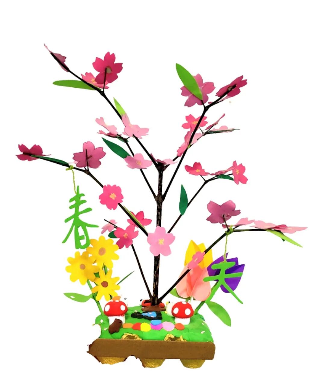用彩纸剪出粉粉的桃花、亮晶晶的小黄花;